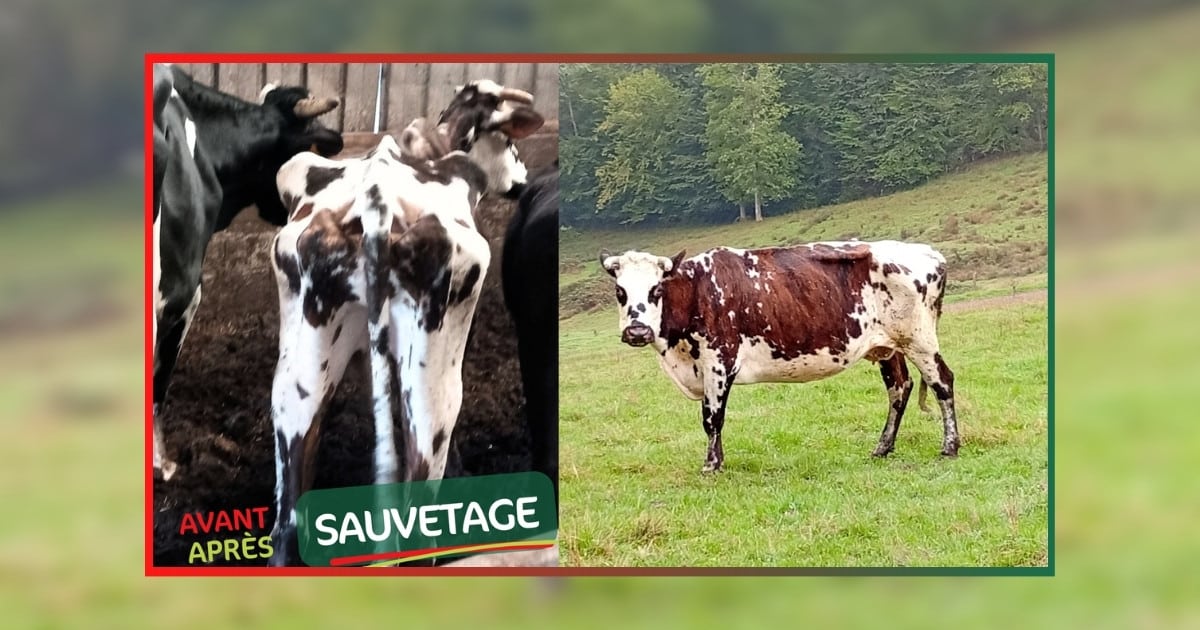 Angélique, la vache de 10 ans, était dans un état corporel effrayant lors de la saisie. Aujourd’hui, bien qu’elle doive encore prendre du poids, elle reprend petit-à-petit et s’épanouit chez Louis au sein des autres bovins du Troupeau du Bonheur.